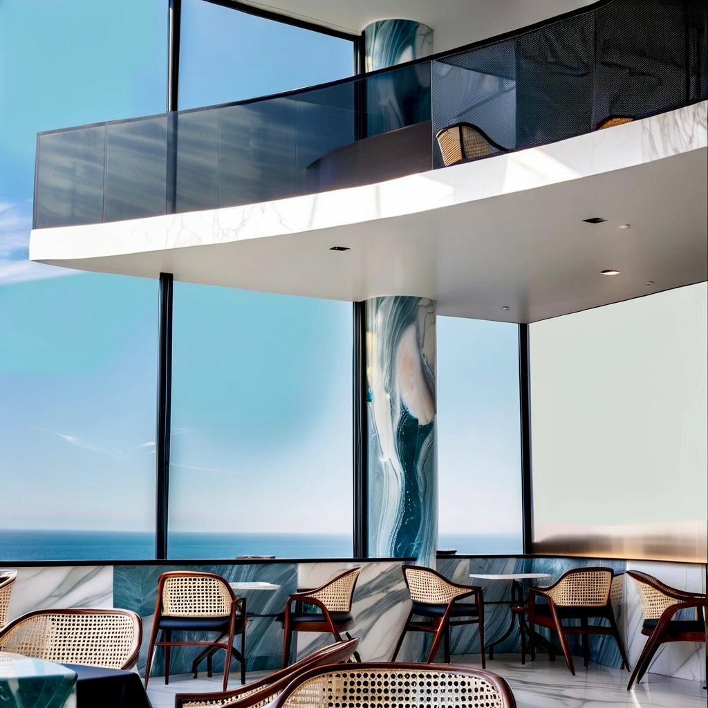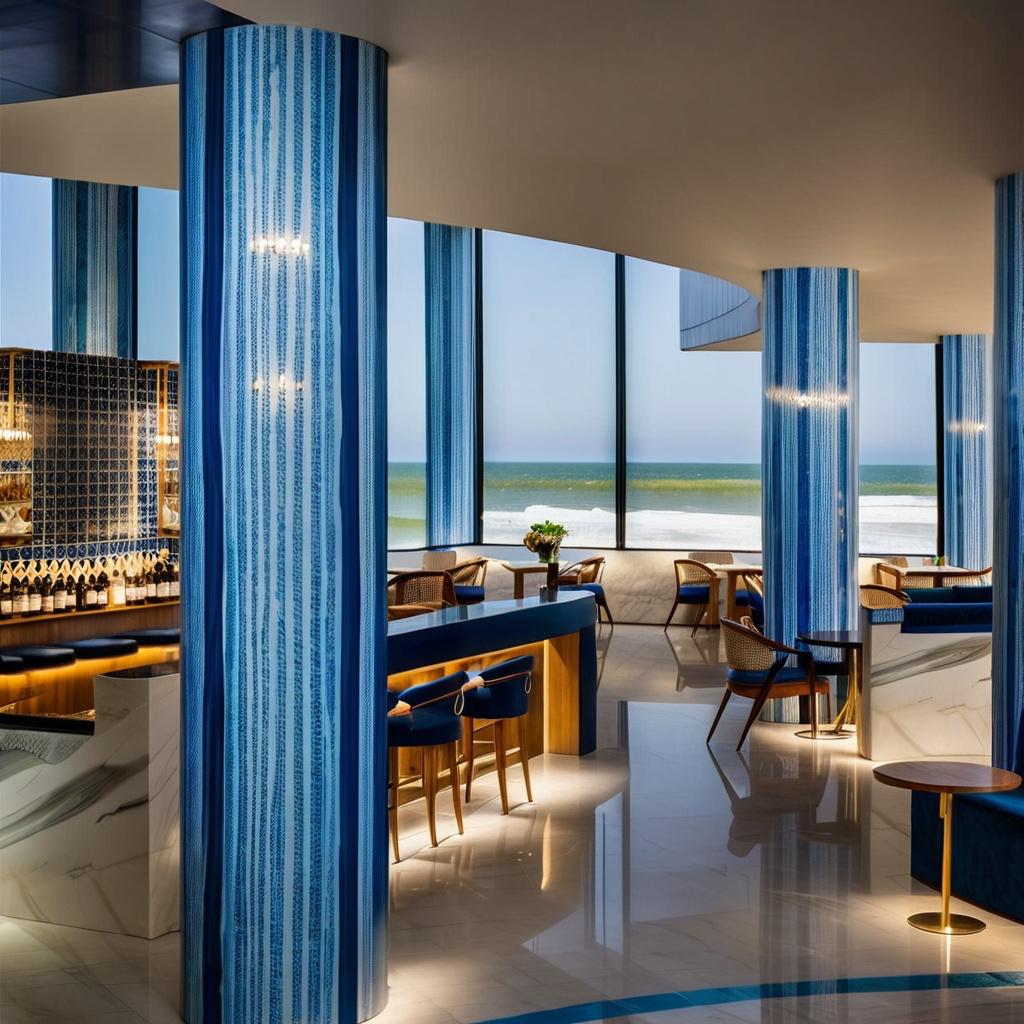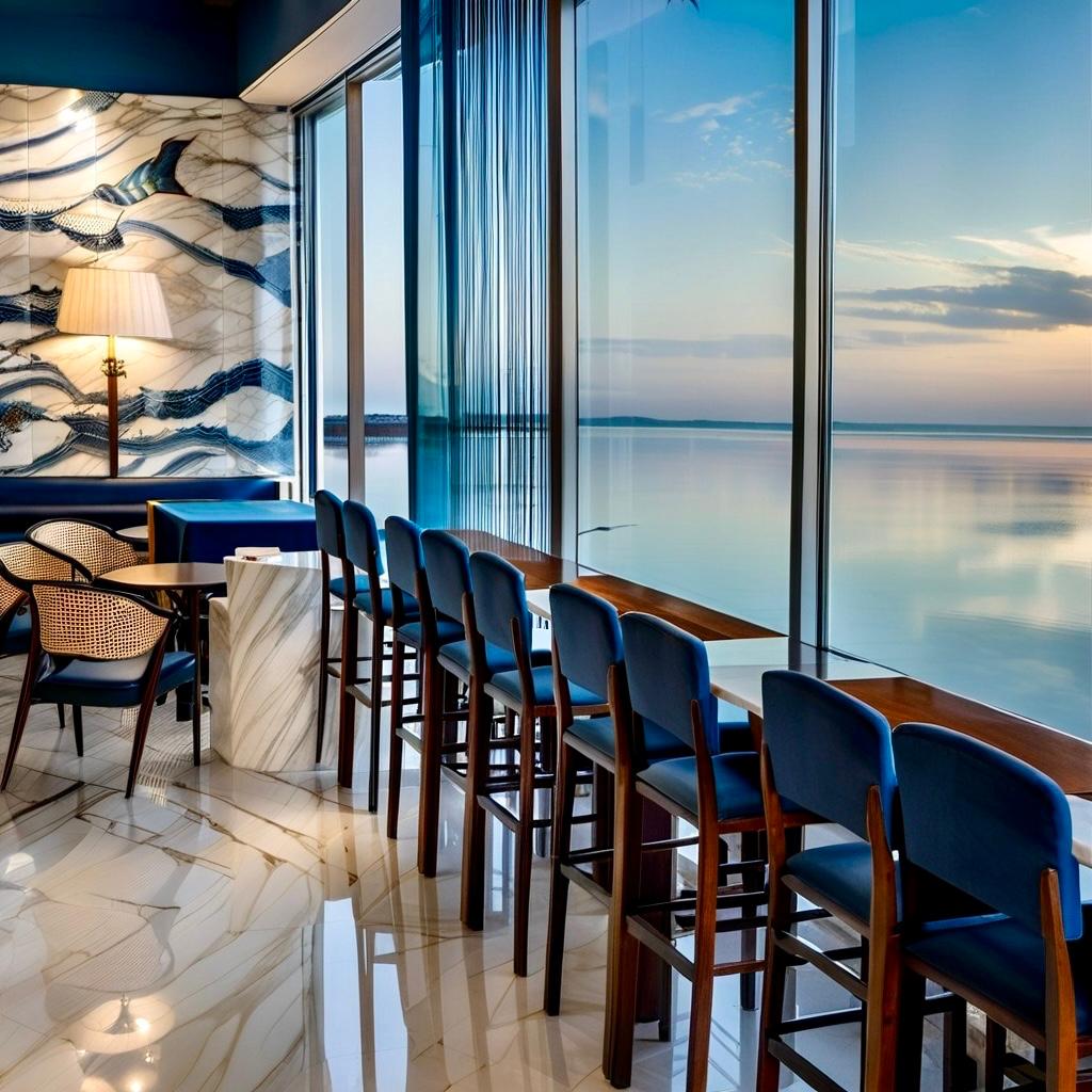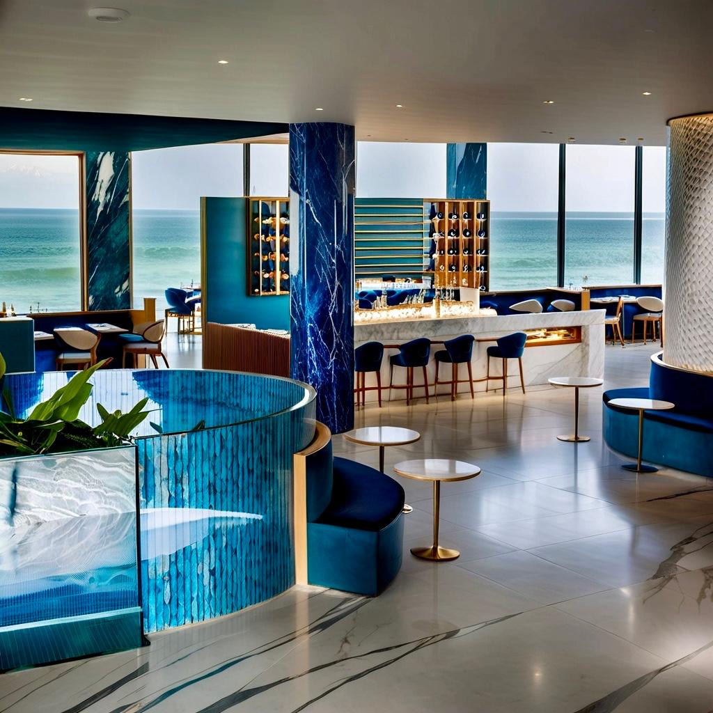 Mavi Tonların Hakimiyeti: Kolonlarda, duvar panellerinde ve mobilya detaylarında kullanılan mavi renkler, mekânın denizle bütünleşen ruhunu güçlendirmiştir.