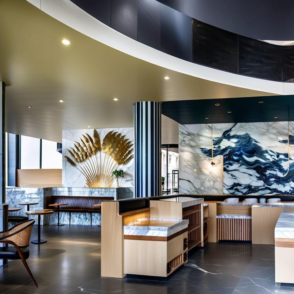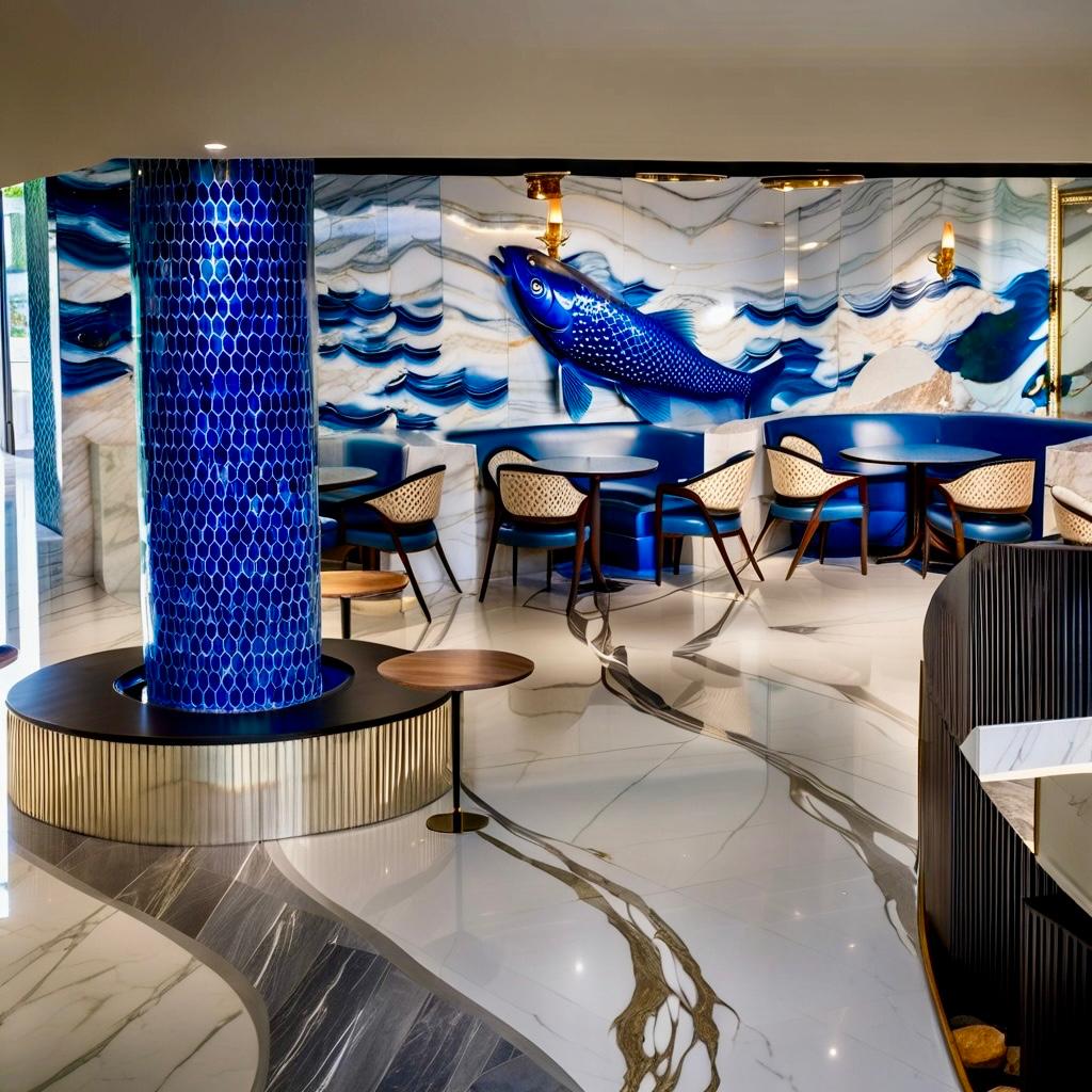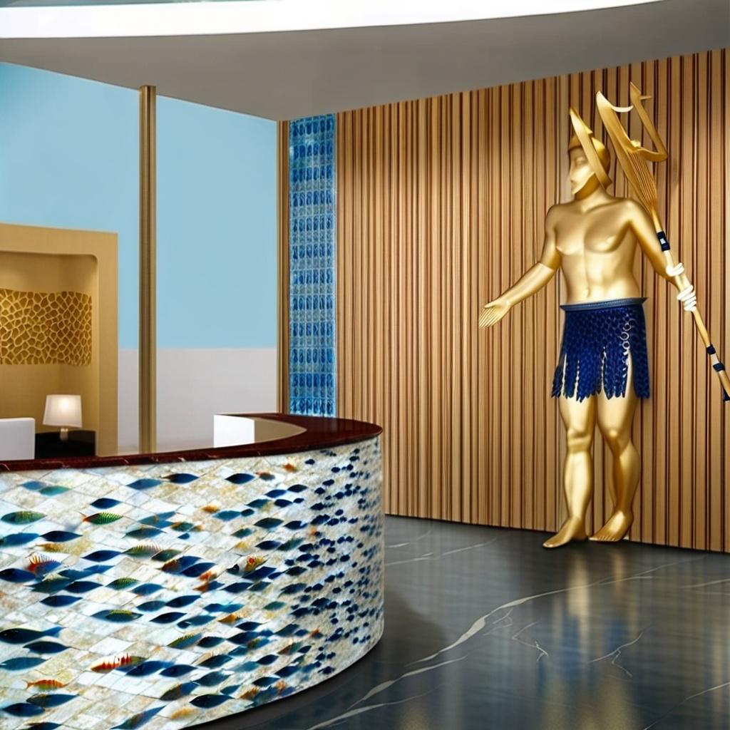 Sanatsal Dokunuşlar: Poseidon heykeli ve dalga desenli dekoratif yüzeyler, restoranın konseptini destekleyen simgesel unsurlar olarak öne çıkmıştır.