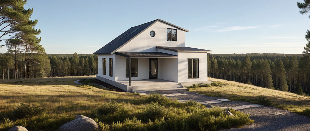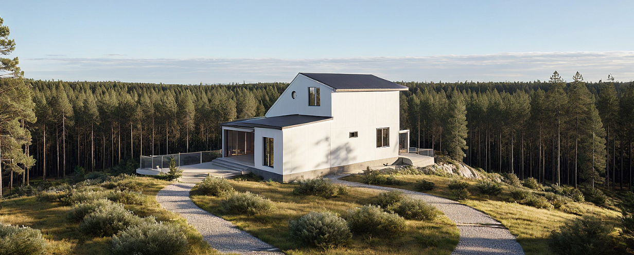 Dış cephede sade modern çizgiler, doğal tonlarda kaplamalar ve kompakt form öne çıkarılmış; böylece hem şehir merkezinde hem de doğa içinde konumlandırılabilecek esnek bir konut çözümü geliştirilmiştir.