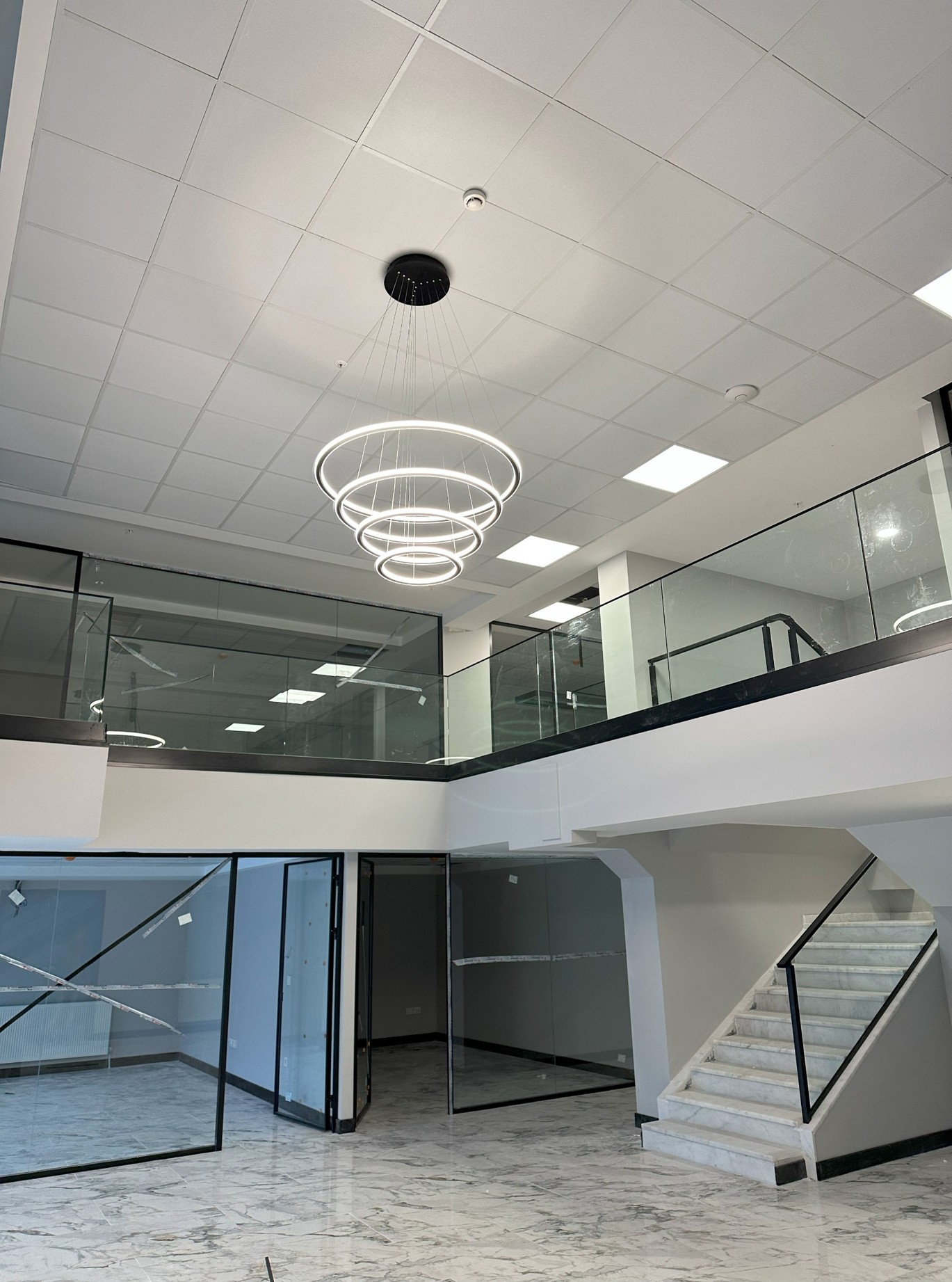 Sarkıt lambalar ve entegre LED aydınlatmalar, mekânın her alanında dengeli bir ışık dağılımı sağlayarak konforlu bir çalışma ortamı oluşturmuştur.